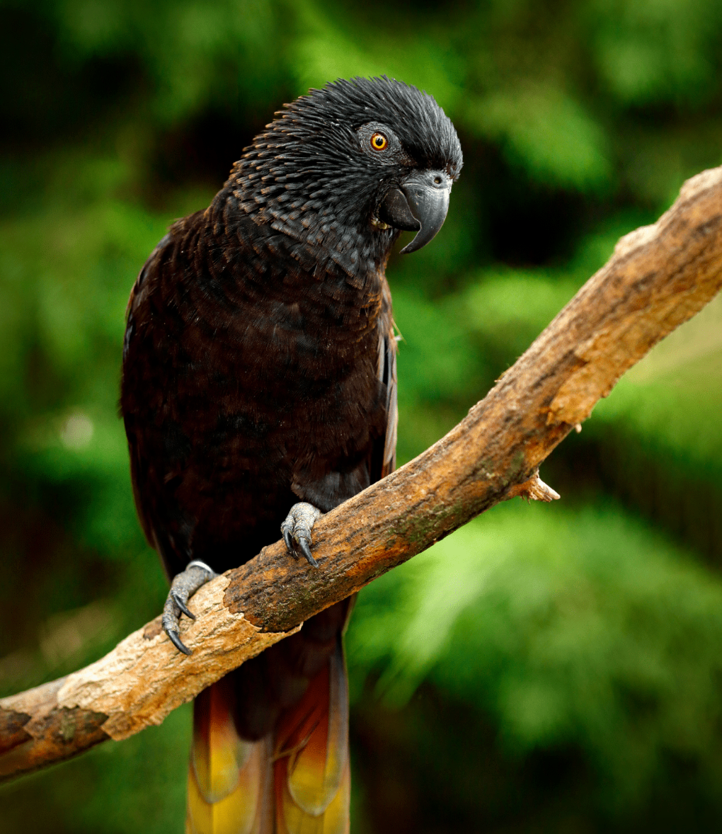 Despite their name, Black Lories aren’t truly black, their deep plumage is a rich charcoal with glowing red highlights on the wings, belly, and tail. In the right light, they almost shimmer. They’re also incredibly agile flyers, darting between trees like little shadows.