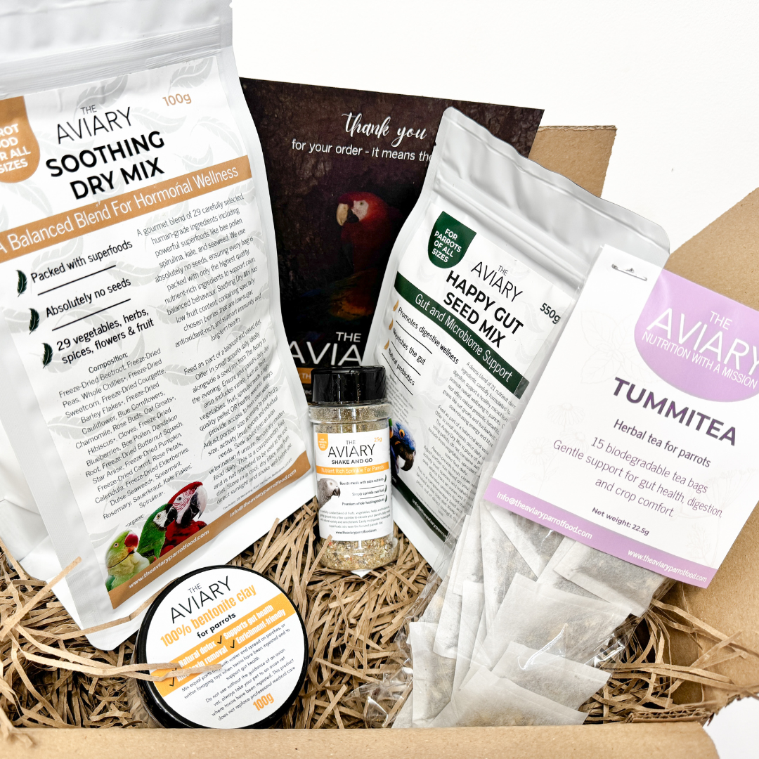 The starter pack includes a selection of gut-supporting, enrichment-focused foods designed to gently introduce parrots to a more natural diet, including our flagship product Soothing Dry Mix, our nutrient topper to support easy diet transition Shake and Go, a pack of our gut soothing parrot safe tea bags Tummitea, our premium gut friendly human-grade seed mix Happy Gut Seed Mix and our 100% human grade calcium bentonite clay for detoxifying - an essential in all parrot diets.